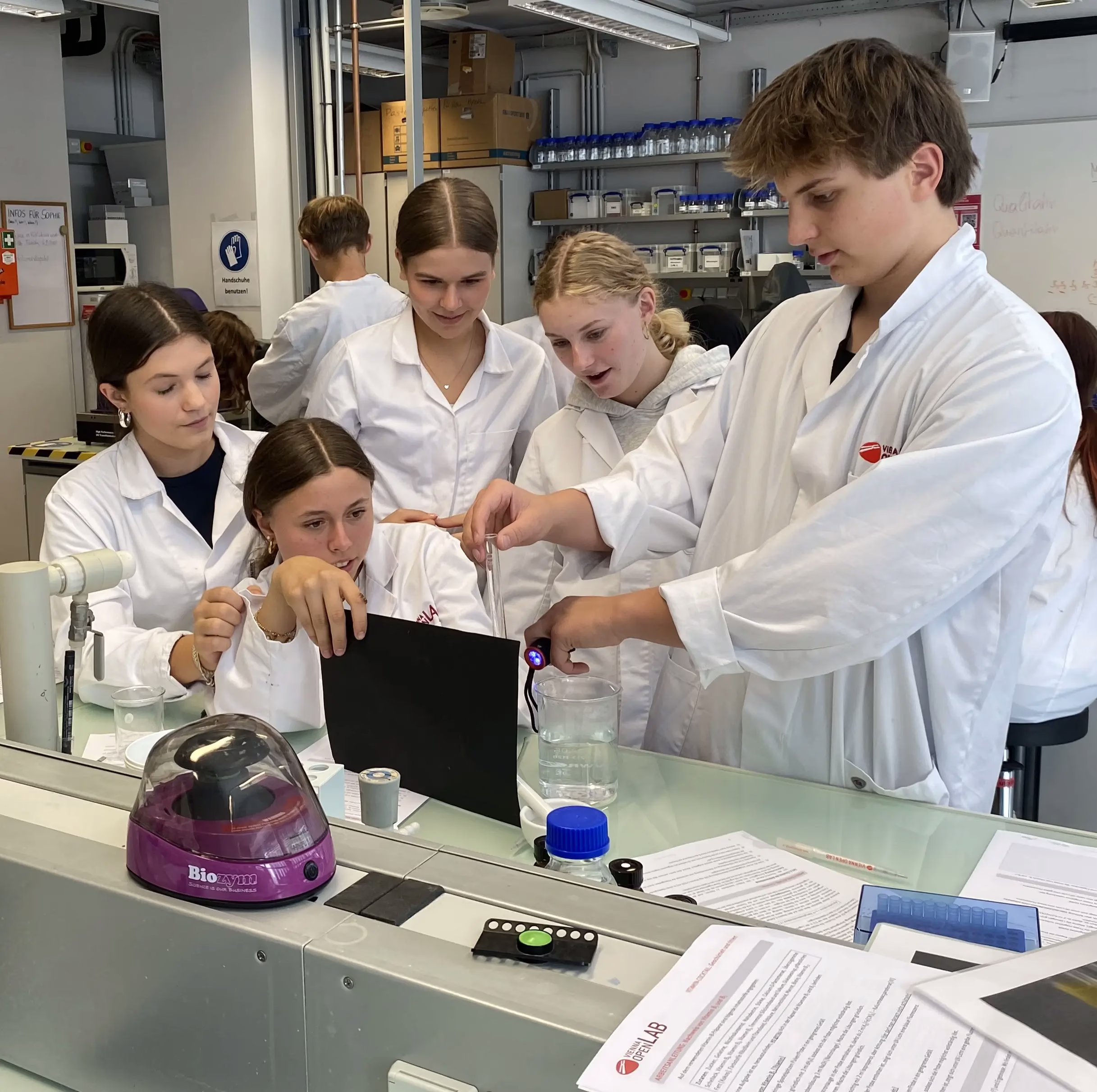Am Montag, den 15. September nahm die 6h2 Klasse an einem Laborkurs im Vienna Open Lab teil. Die Schülerinnen und Schüler durften die Vitamine B1 und B2 in Nahrungsergänzungsmitteln nachweisen, sowie die Menge an Vitamin C in verschiedenen Orangensäften bestimmen. Es wurde geschüttelt und titriert und die Schülerinnen und Schüler hatten so einige Aha-Erlebnisse, vor allem dort, wo sie eigentlich andere Ergebnisse vermutet hätten. Alles in Allem war es ein spannender und lehrreicher Tag in einem hervorragend ausgestatteten Labor und mit äußerst bemühten und freundlichen Laborleiterinnen.
